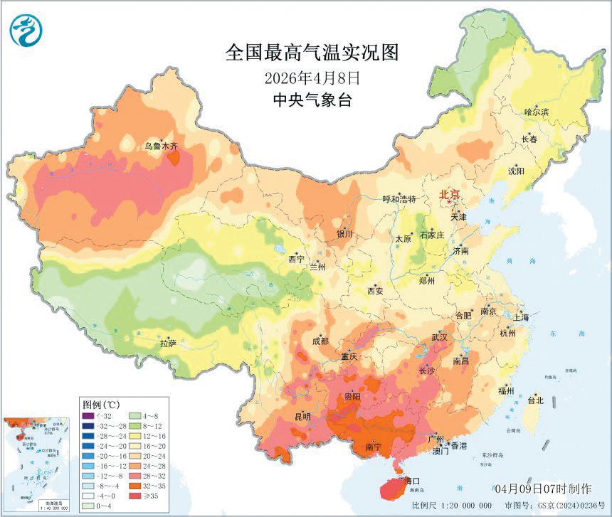 海南4月8日20时-9日20时最高温预报图。 海南省气象台制图